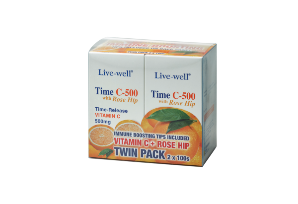 Live-well Time C-500 has been specially formulated with Rose Hip is a time-released Vitamin C supplement that provides a prolonged rate of absorption by releasing nutrients slowly, ensuring that Vitamin C is available whenever your body needs it. Rose hip is a natural plant flavonoid.